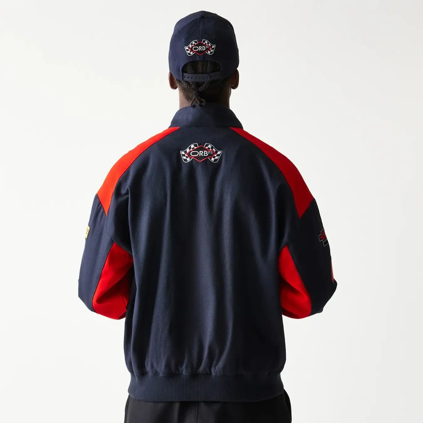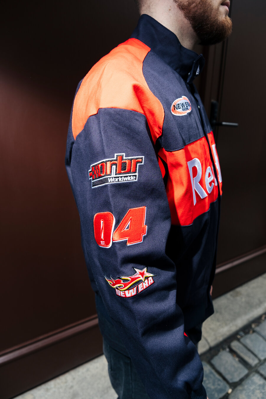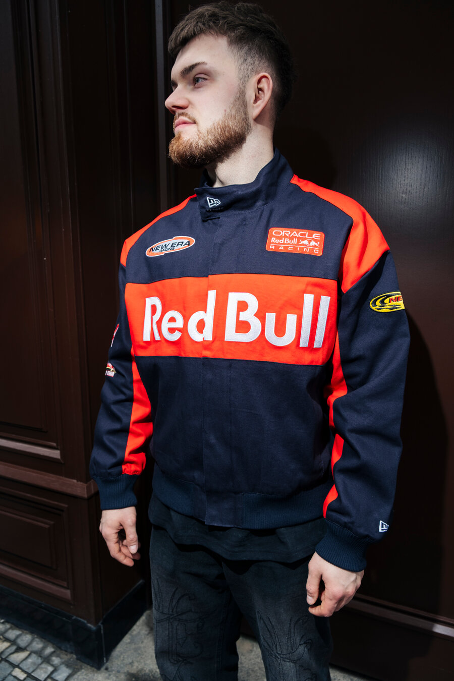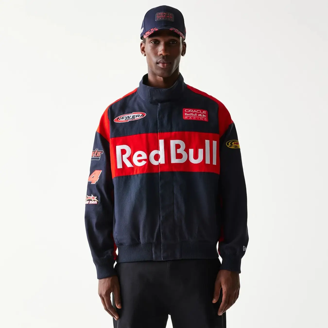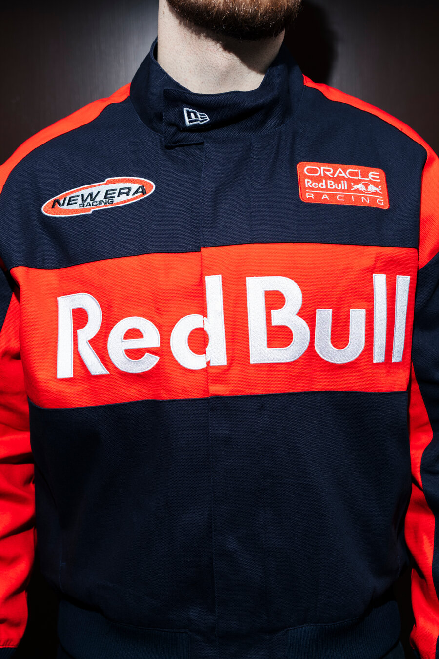 Tmavě Modrá pánská Podzimní bunda značky New Era s motivem týmu RED BULL F1.