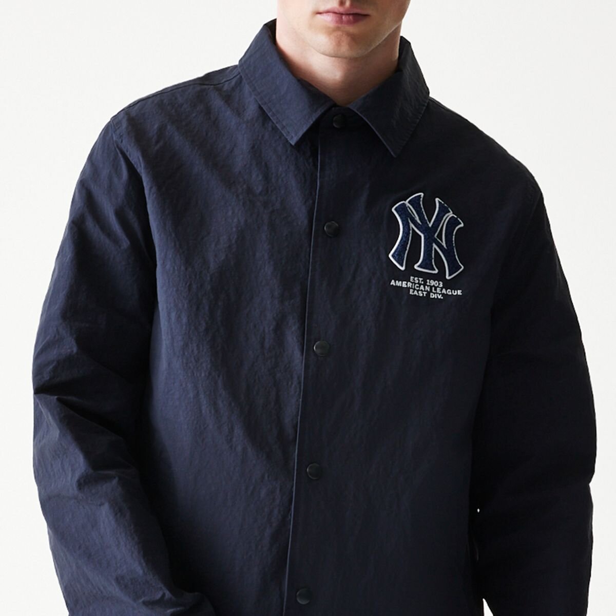 Tmavě Modrá pánská Podzimní bunda značky New Era s motivem baseballového týmu New York Yankees.