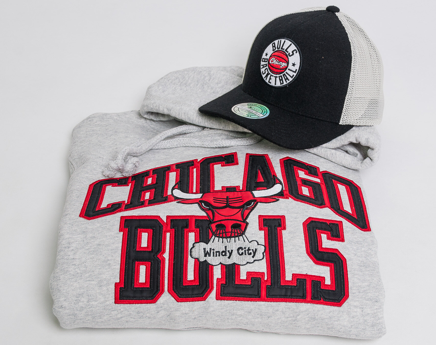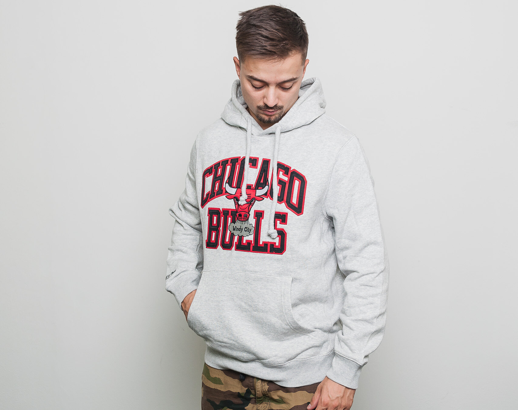 Šedá pánská mikina značky Mitchell & Ness s motivem basketbalového týmu Chicago Bulls.